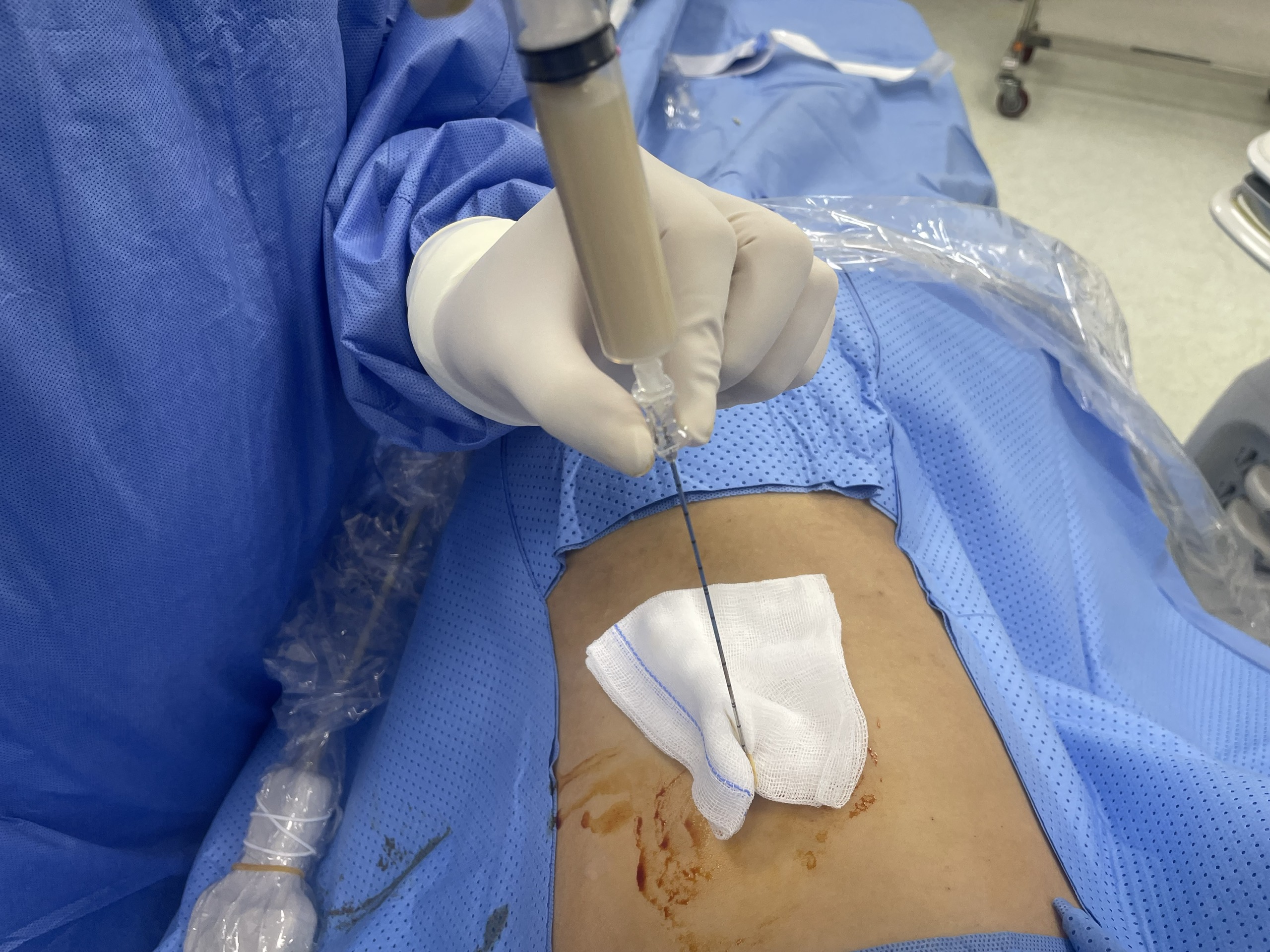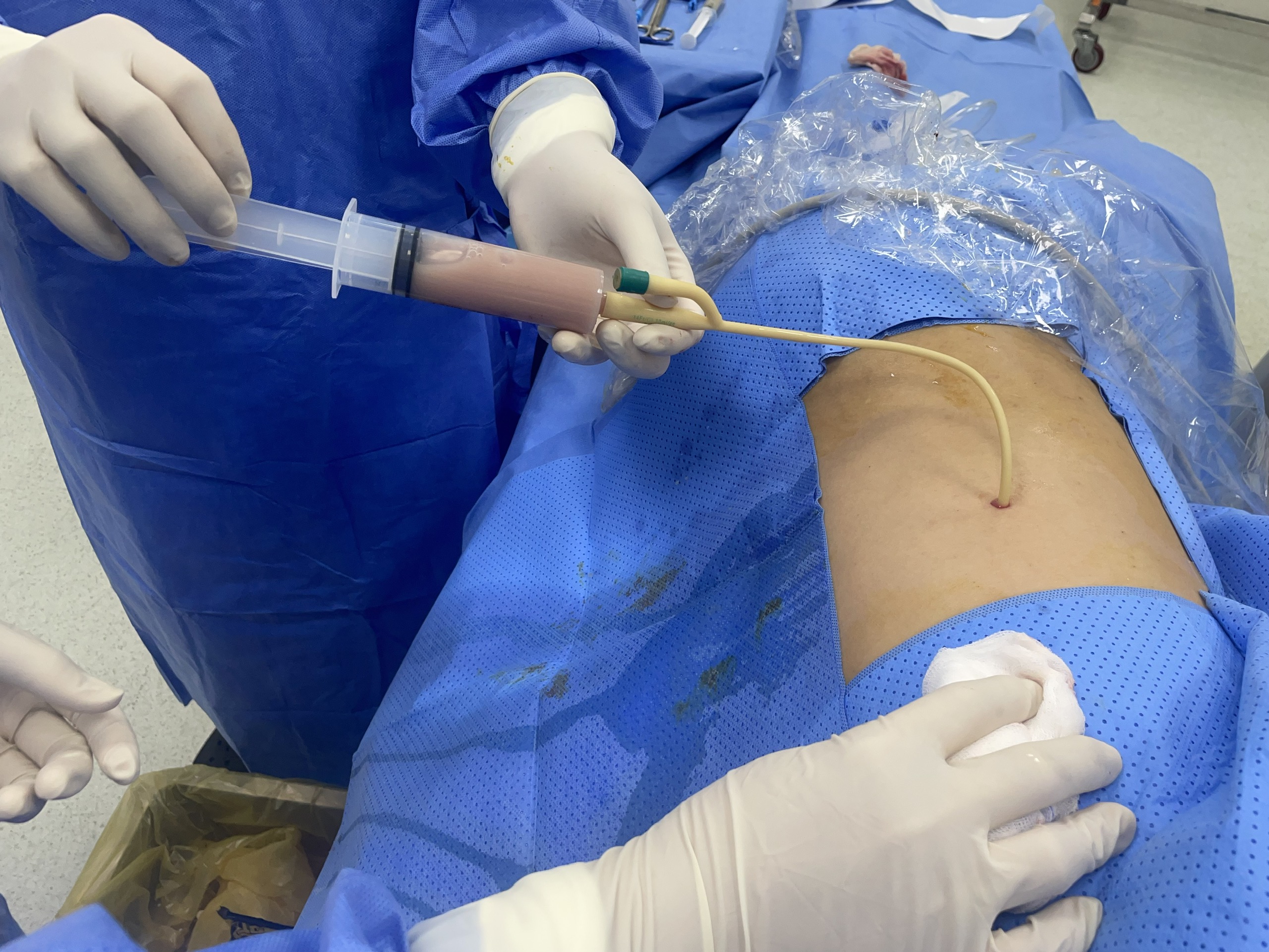 Hình ảnh sỏi niệu quản gây ứ mủ thận được xử trí dẫn lưu mủ thận cấp cứu dưới hướng dẫn siêu âm
